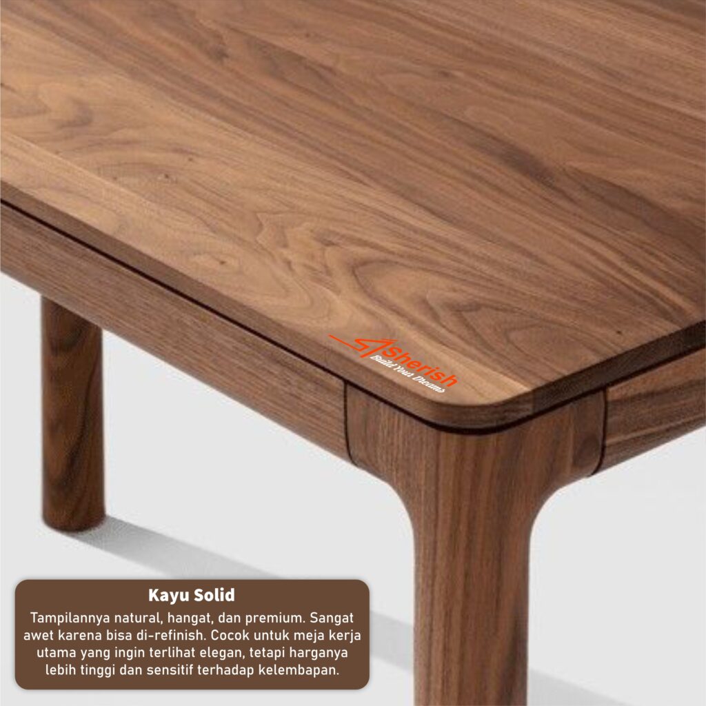 Tampilannya natural, hangat, dan premium. Sangat awet karena bisa di-refinish. Cocok untuk meja kerja utama yang ingin terlihat elegan, tetapi harganya lebih tinggi dan sensitif terhadap kelembapan.