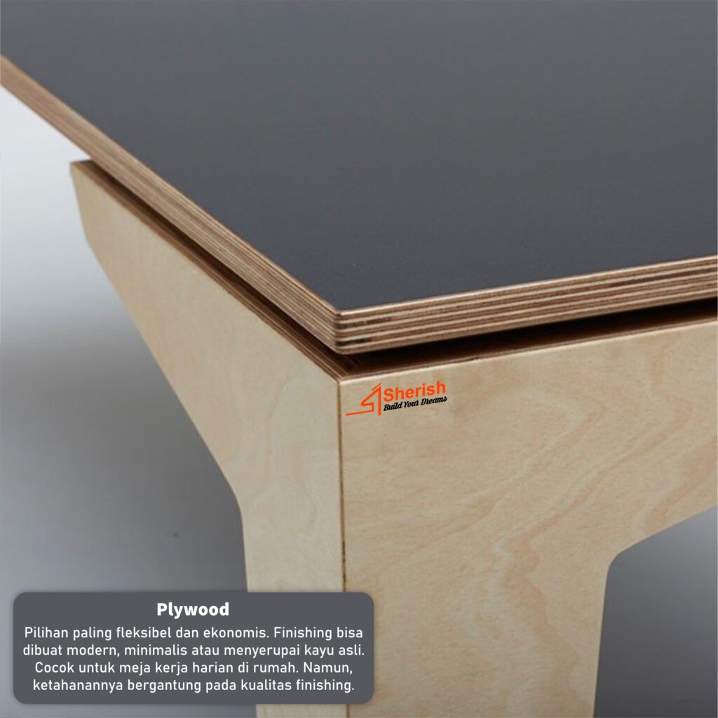 Pilihan paling fleksibel dan ekonomis. Finishing bisa dibuat modern, minimalis atau menyerupai kayu asli. Cocok untuk meja kerja harian di rumah. Namun, ketahanannya bergantung pada kualitas finishing.