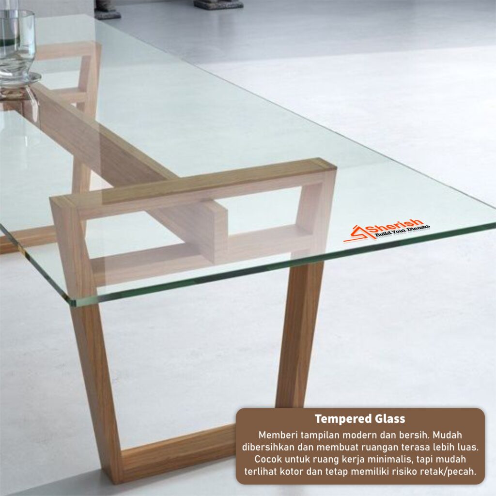 Memberi tampilan modern dan bersih. Mudah dibersihkan dan membuat ruangan terasa lebih luas. Cocok untuk ruang kerja minimalis, tapi mudah terlihat kotor dan tetap memiliki risiko retak/pecah.