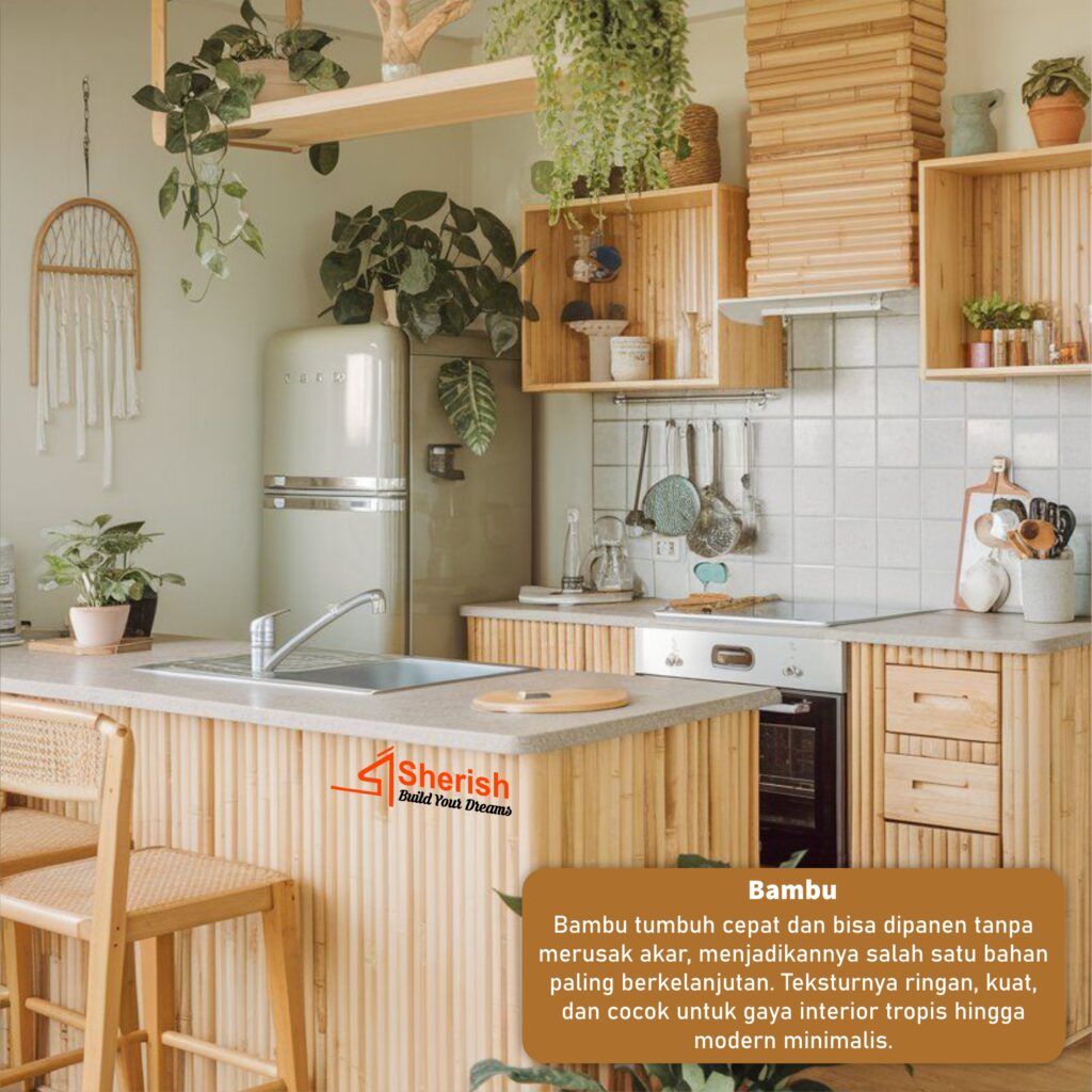 Bambu tumbuh cepat dan bisa dipanen tanpa merusak akar, menjadikannya salah satu bahan paling berkelanjutan. Teksturnya ringan, kuat, dan cocok untuk gaya interior tropis hingga modern minimalis.