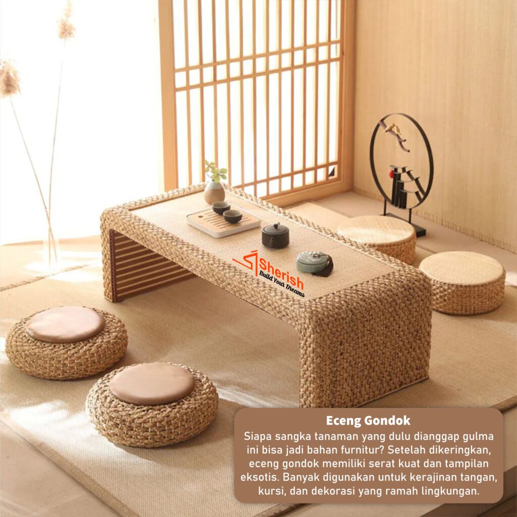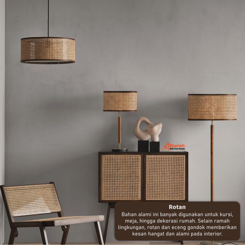 Bahan alami ini banyak digunakan untuk kursi, meja, hingga dekorasi rumah. Selain ramah lingkungan, rotan dan eceng gondok memberikan kesan hangat dan alami pada interior.