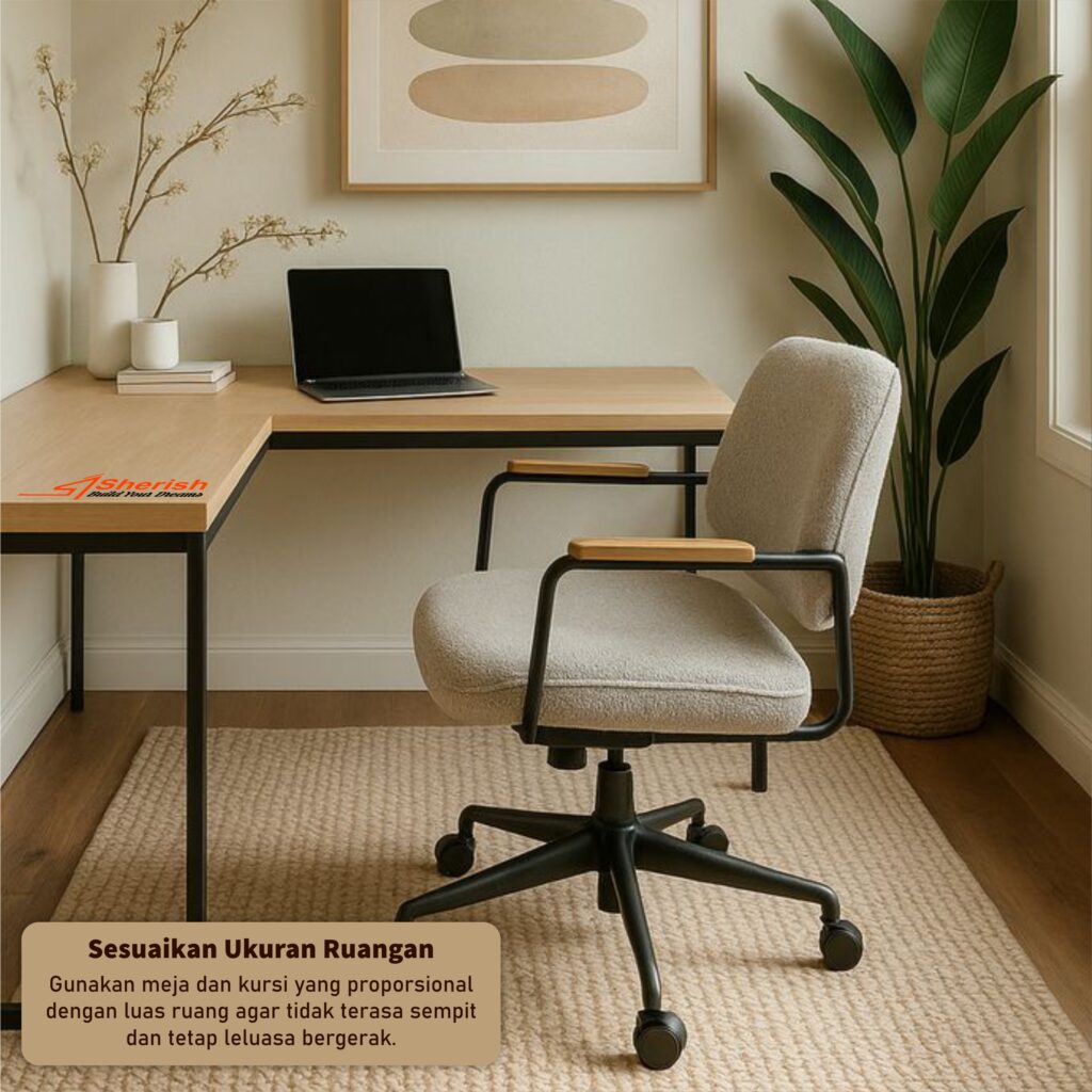 Gunakan meja dan kursi yang proporsional dengan luas ruang agar tidak terasa sempit dan tetap leluasa bergerak.
