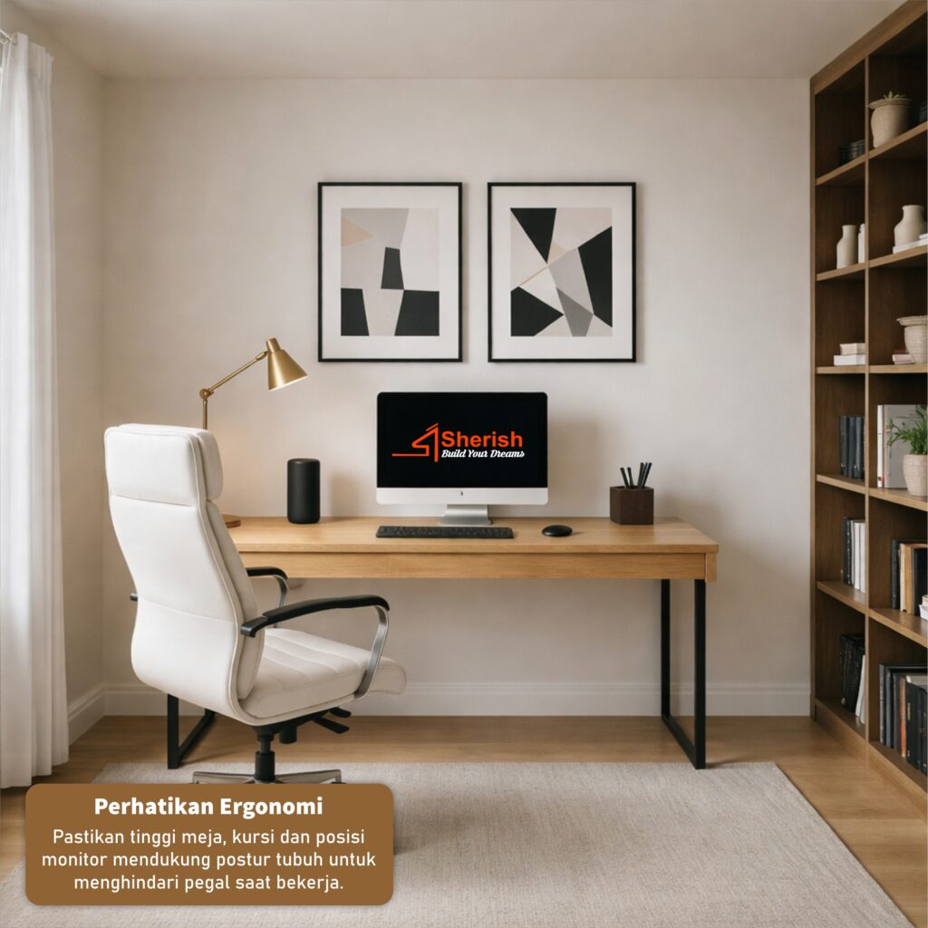 Pastikan tinggi meja, kursi dan posisi monitor mendukung postur tubuh untuk menghindari pegal saat bekerja.