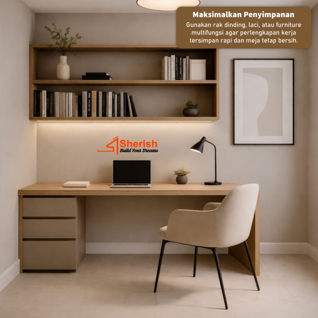 Gunakan rak dinding, laci, atau furniture multifungsi agar perlengkapan kerja tersimpan rapi dan meja tetap bersih.