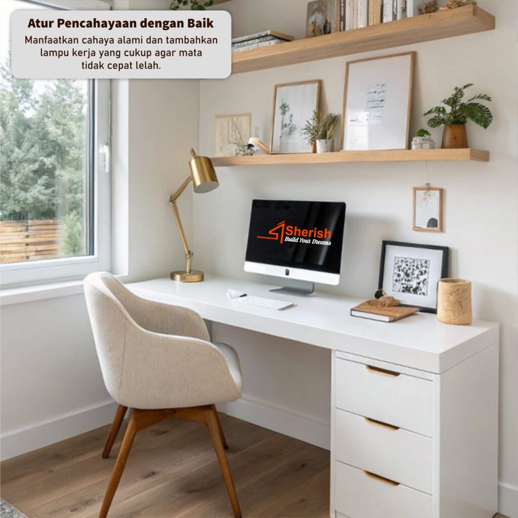 Manfaatkan cahaya alami dan tambahkan lampu kerja yang cukup agar mata tidak cepat lelah.