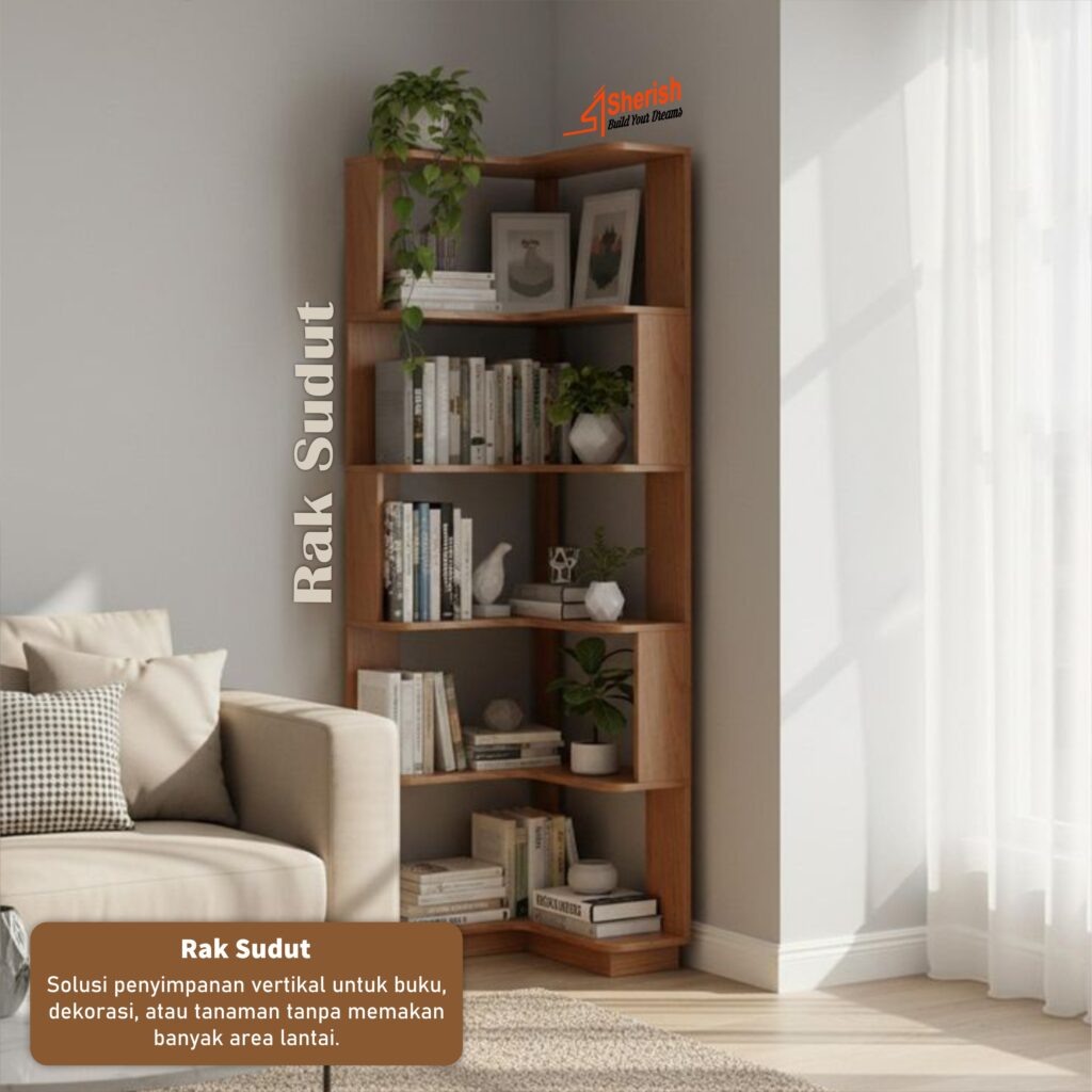Solusi penyimpanan vertikal untuk buku, dekorasi, atau tanaman tanpa memakan banyak area lantai.