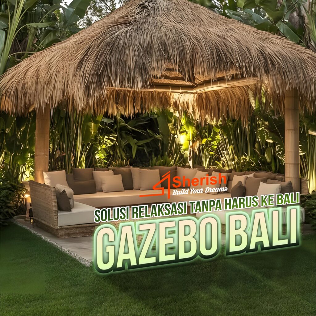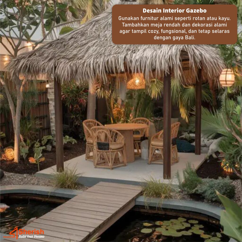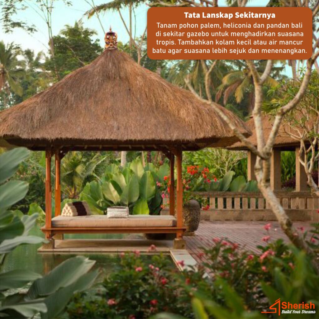 Tanam pohon palem, heliconia dan pandan bali di sekitar gazebo untuk menghadirkan suasana tropis. Tambahkan kolam kecil atau air mancur batu agar suasana lebih sejuk dan menenangkan.