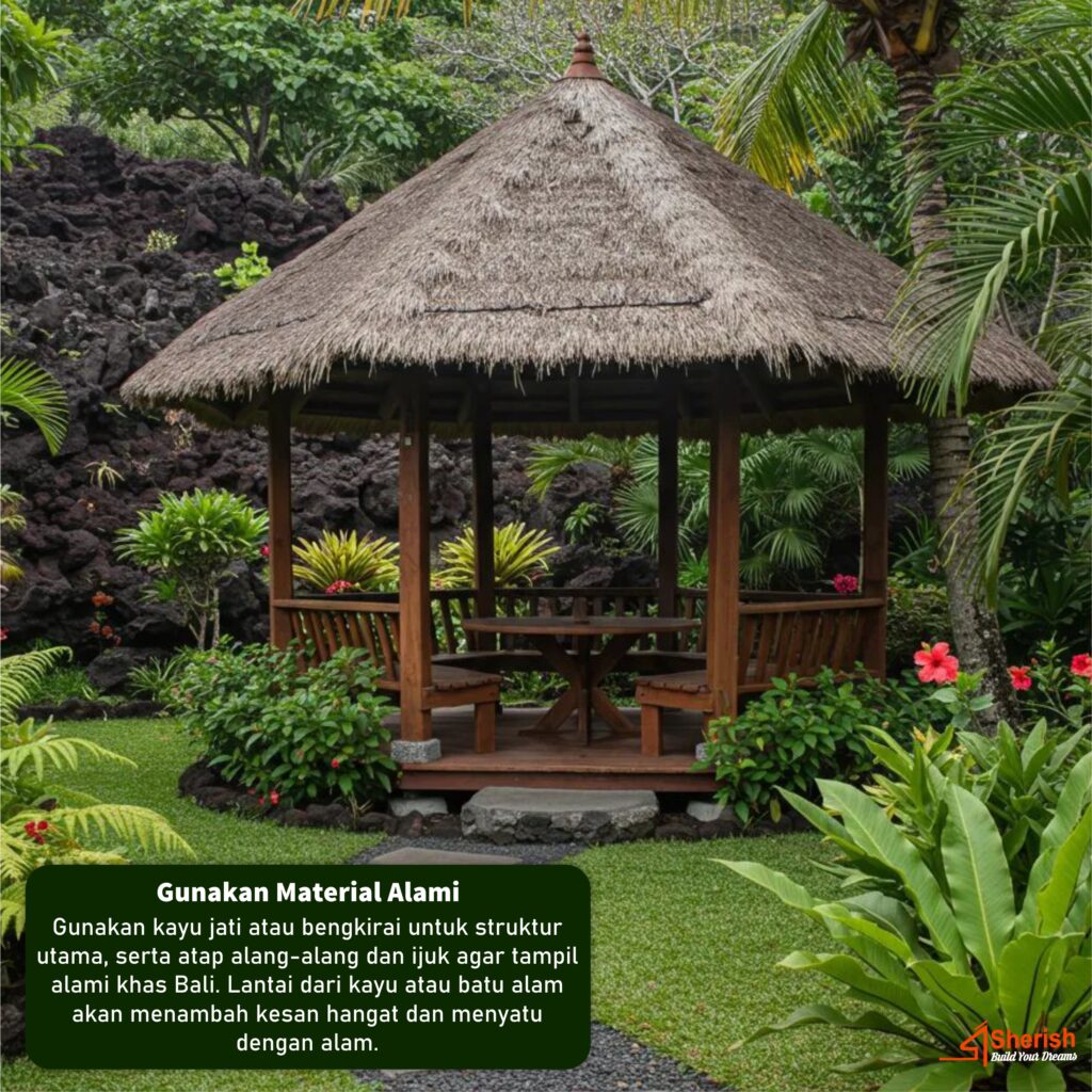 Gunakan kayu jati atau bengkirai untuk struktur utama, serta atap alang-alang dan ijuk agar tampil alami khas Bali. Lantai dari kayu atau batu alam akan menambah kesan hangat dan menyatu dengan alam.
