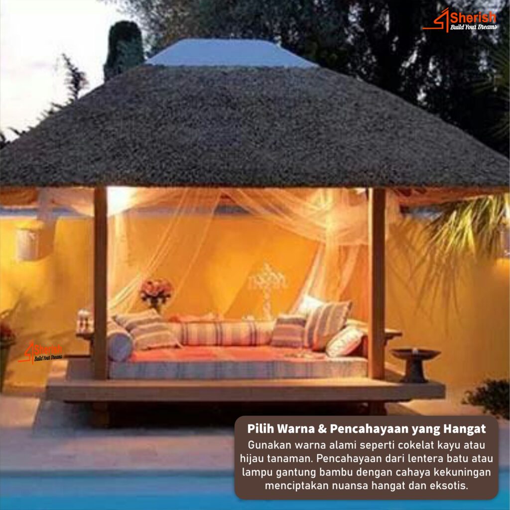 Gunakan warna alami seperti cokelat kayu atau hijau tanaman. Pencahayaan dari lentera batu atau lampu gantung bambu dengan cahaya kekuningan menciptakan nuansa hangat dan eksotis.