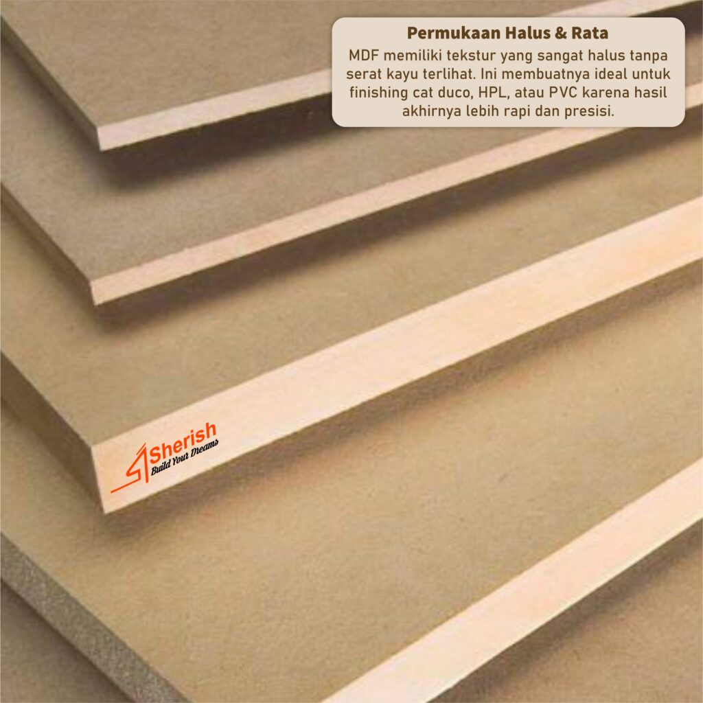 MDF memiliki tekstur yang sangat halus tanpa serat kayu terlihat. Ini membuatnya ideal untuk finishing cat duco, HPL, atau PVC karena hasil akhirnya lebih rapi dan presisi.
