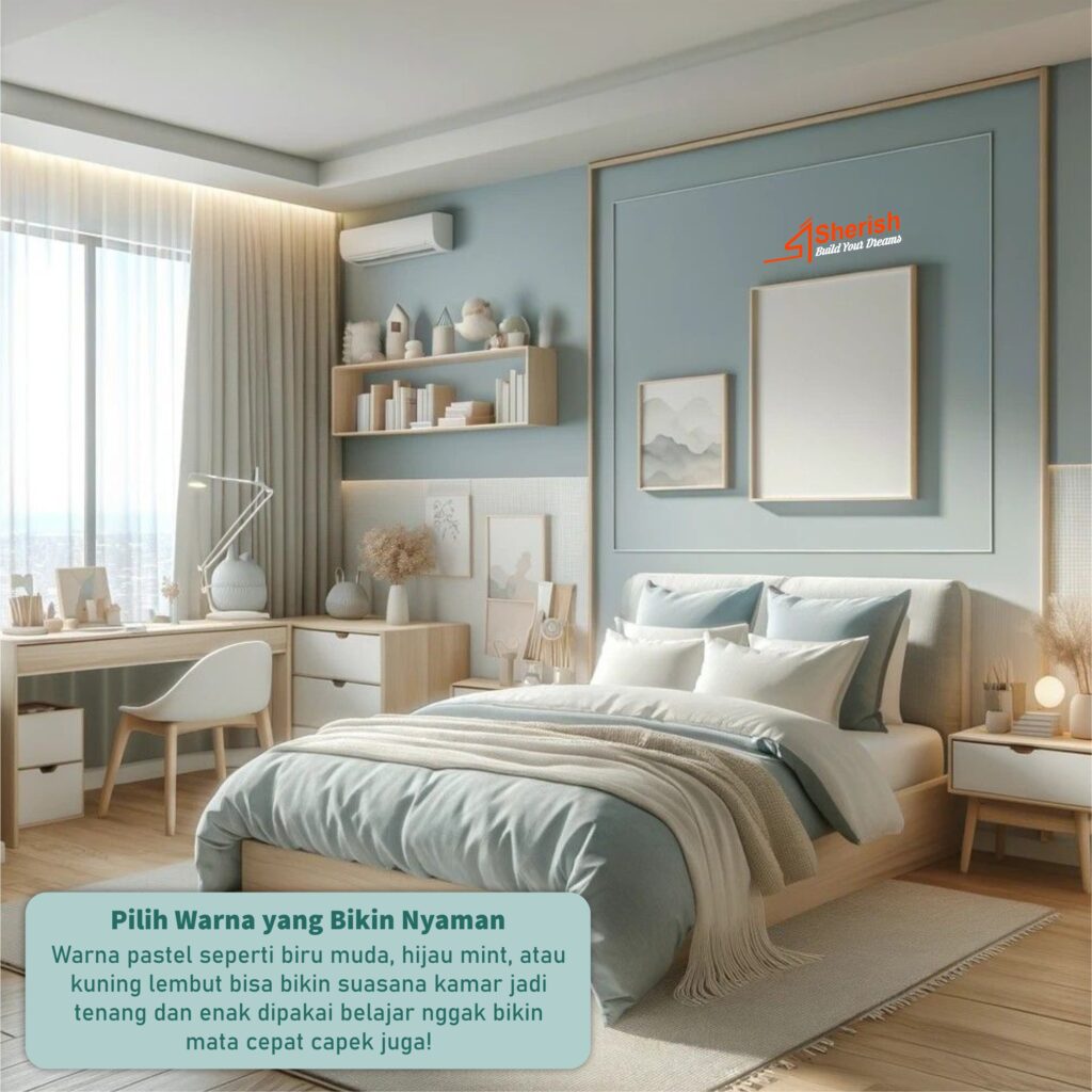 Warna pastel seperti biru muda, hijau mint, atau kuning lembut bisa bikin suasana kamar jadi tenang dan enak dipakai belajar — nggak bikin mata cepat capek juga!