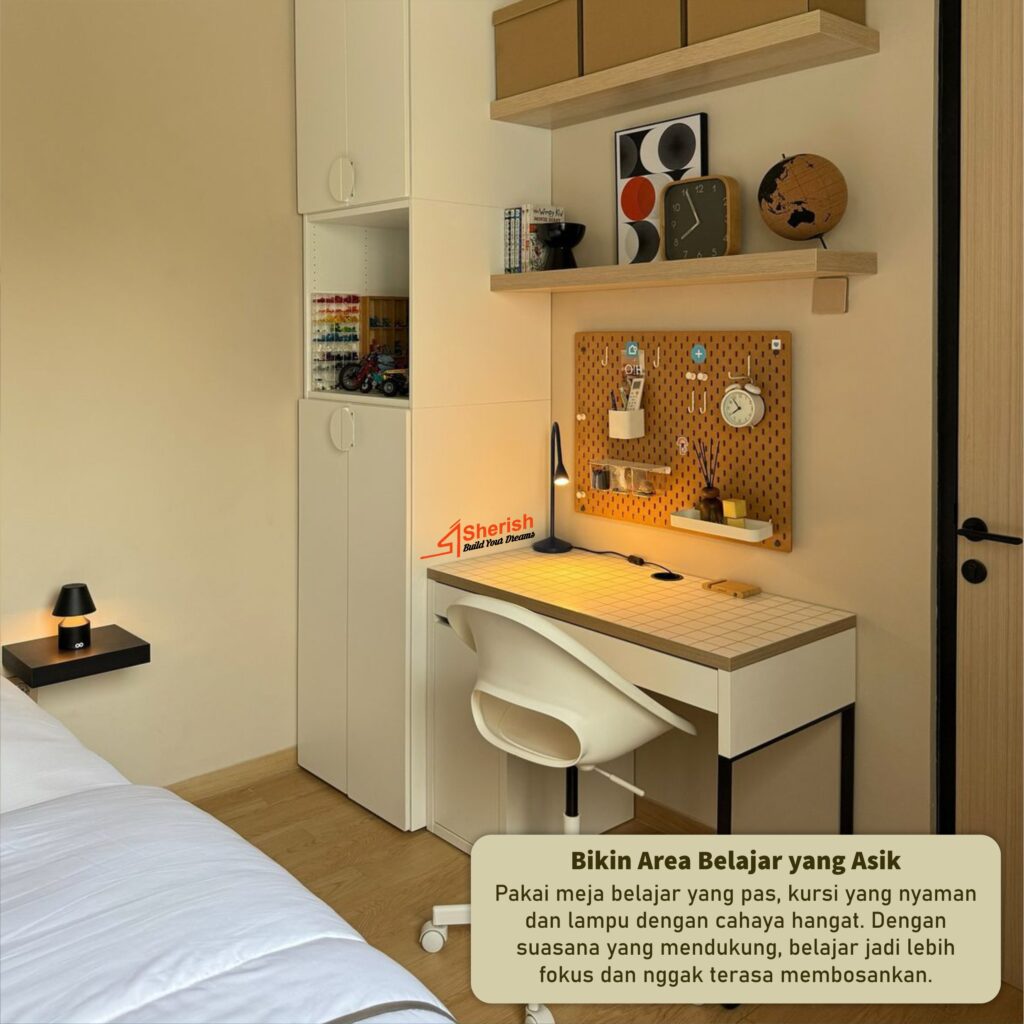 Pakai meja belajar yang pas, kursi yang nyaman, dan lampu dengan cahaya hangat. Dengan suasana yang mendukung, belajar jadi lebih fokus dan nggak terasa membosankan.