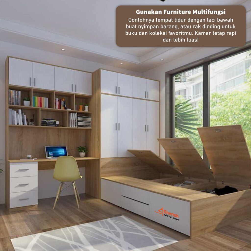 Contohnya tempat tidur dengan laci bawah buat nyimpan barang, atau rak dinding untuk buku dan koleksi favoritmu. Kamar tetap rapi dan lebih luas!