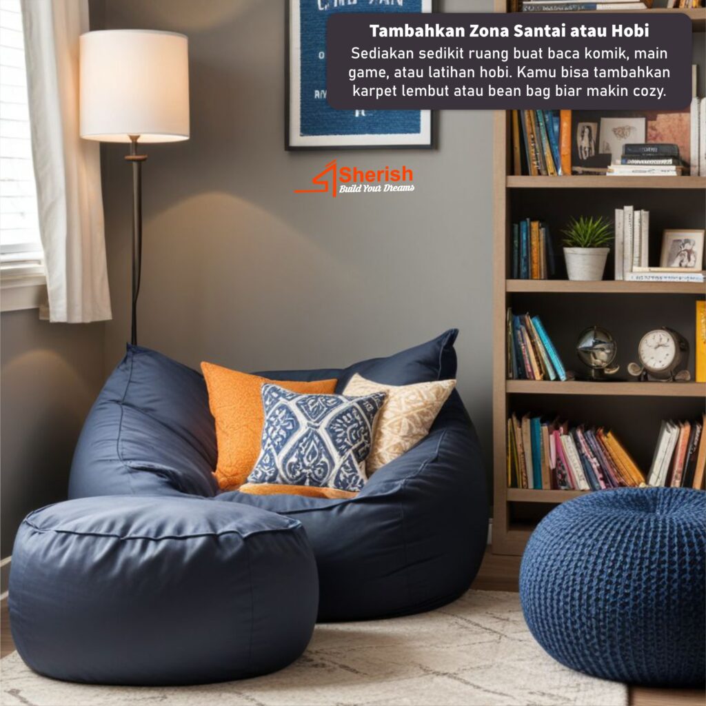Sediakan sedikit ruang buat baca komik, main game, atau latihan hobi. Kamu bisa tambahkan karpet lembut atau bean bag biar makin cozy.