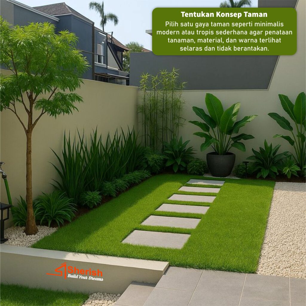 Pilih satu gaya taman seperti minimalis modern atau tropis sederhana agar penataan tanaman, material, dan warna terlihat selaras dan tidak berantakan.