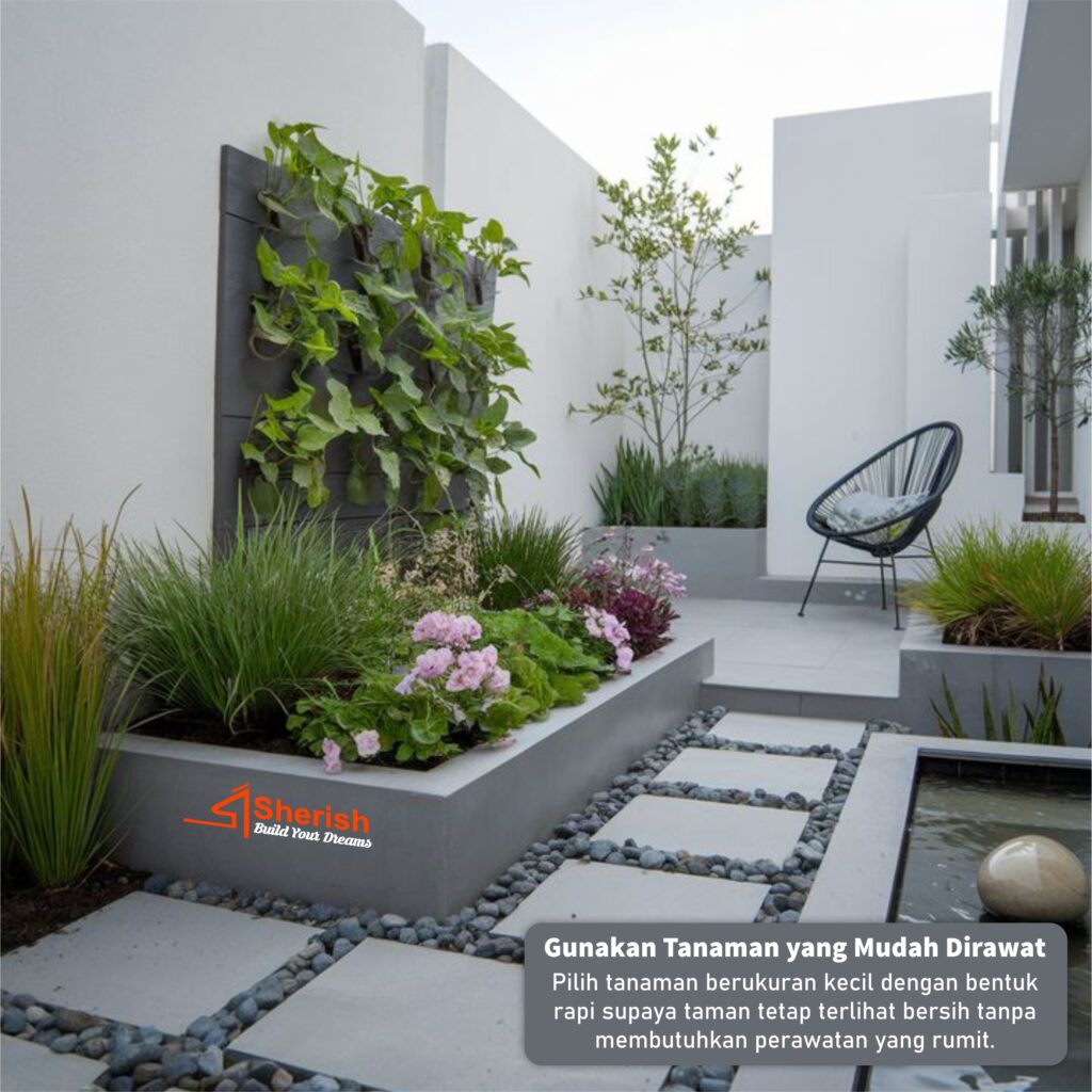 Pilih tanaman berukuran kecil dengan bentuk rapi supaya taman tetap terlihat bersih tanpa membutuhkan perawatan yang rumit.