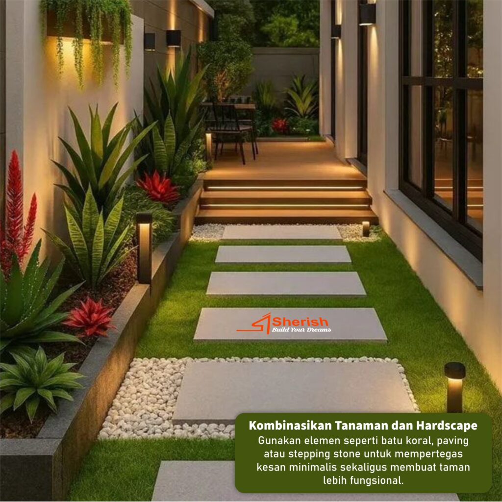 Gunakan elemen seperti batu koral, paving, atau stepping stone untuk mempertegas kesan minimalis sekaligus membuat taman lebih fungsional.