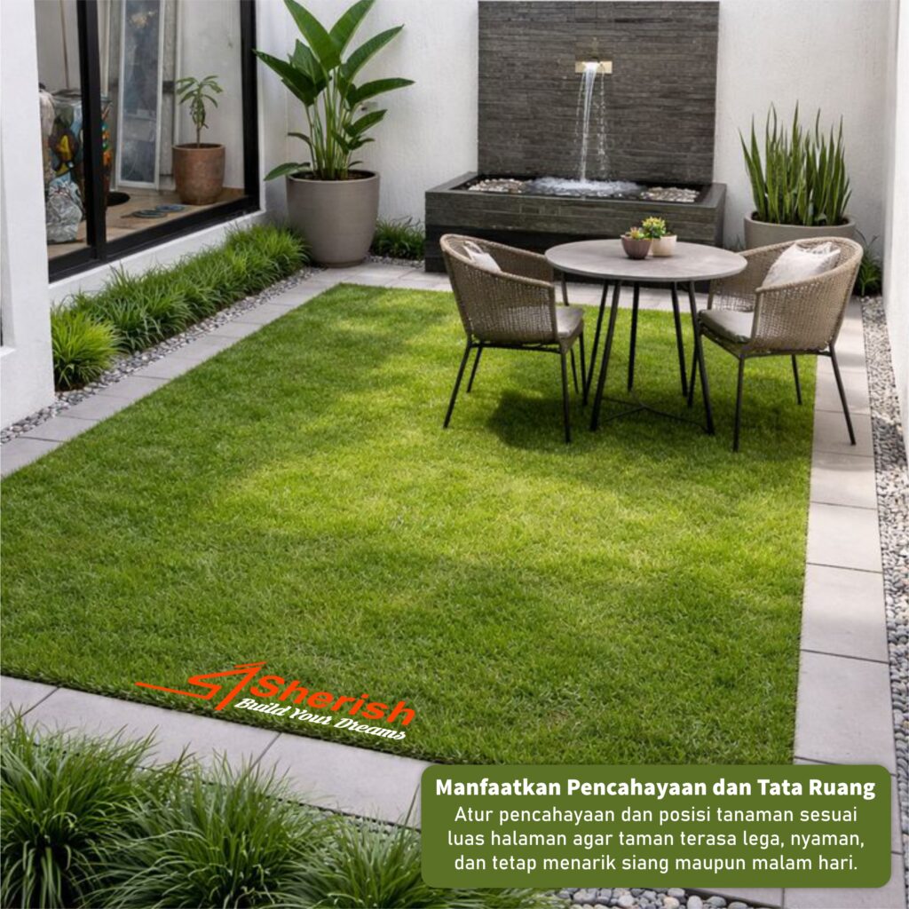 Atur pencahayaan dan posisi tanaman sesuai luas halaman agar taman terasa lega, nyaman, dan tetap menarik siang maupun malam hari.