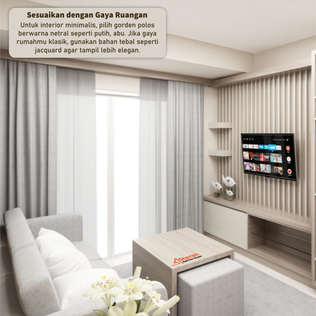 Untuk interior minimalis, pilih gorden polos berwarna netral seperti putih, abu. Jika gaya rumahmu klasik, gunakan bahan tebal seperti jacquard agar tampil lebih elegan.