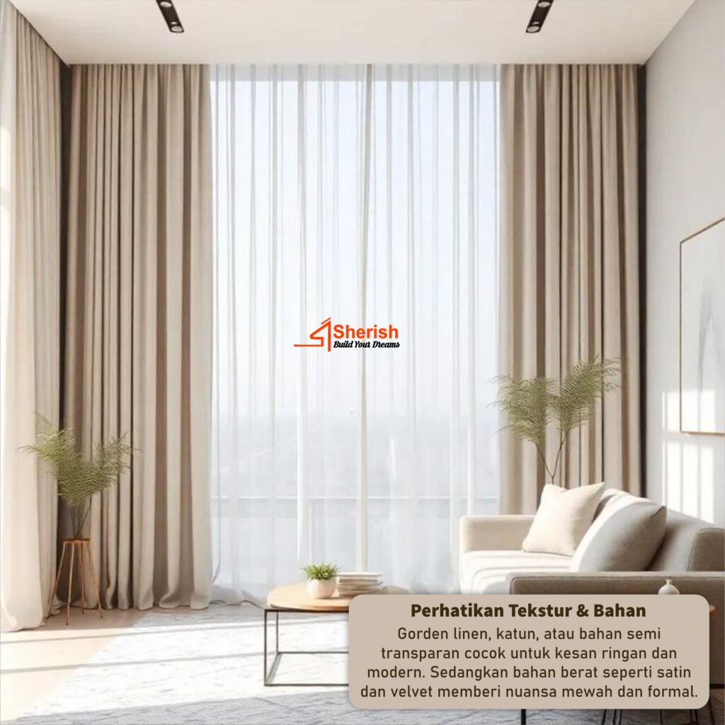 Gorden linen, katun, atau bahan semi-transparan cocok untuk kesan ringan dan modern. Sedangkan bahan berat seperti satin dan velvet memberi nuansa mewah dan formal.