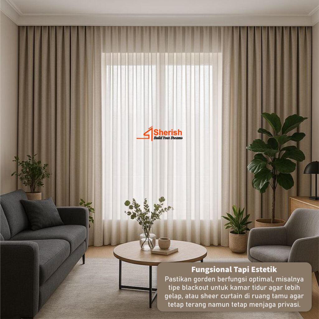 Pastikan gorden berfungsi optimal—misalnya tipe blackout untuk kamar tidur agar lebih gelap, atau sheer curtain di ruang tamu agar tetap terang namun tetap menjaga privasi.
