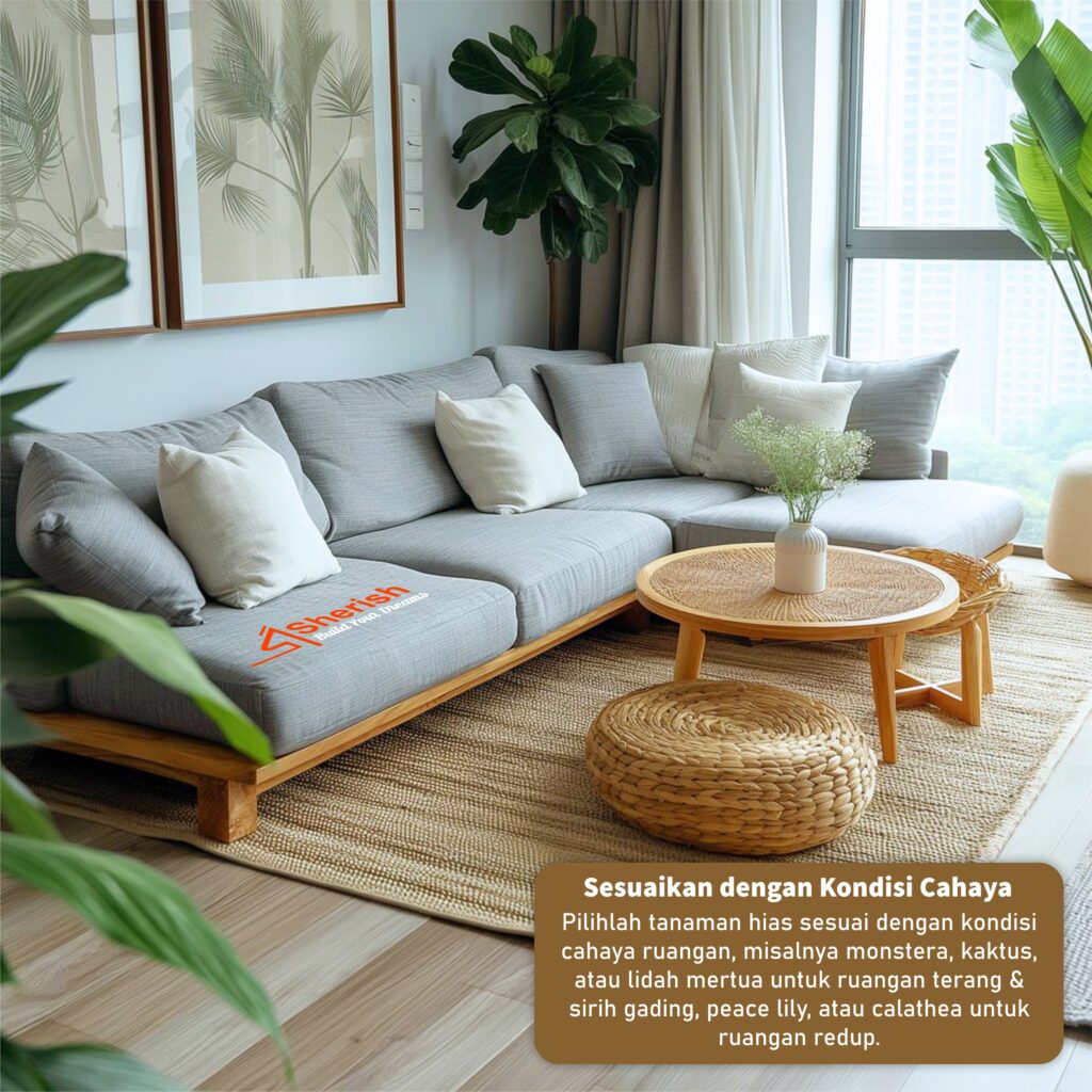 Pilihlah tanaman hias sesuai dengan kondisi cahaya ruangan, misalnya monstera, kaktus, atau lidah mertua untuk ruangan terang, dan sirih gading, peace lily, atau calathea untuk ruangan redup.