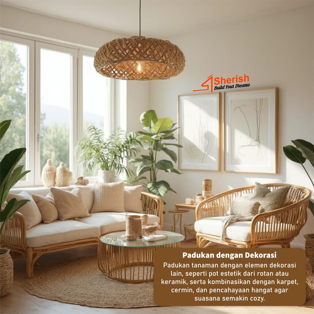 Padukan tanaman dengan elemen dekorasi lain, seperti pot estetik dari rotan atau keramik, serta kombinasikan dengan karpet, cermin, dan pencahayaan hangat agar suasana semakin cozy.