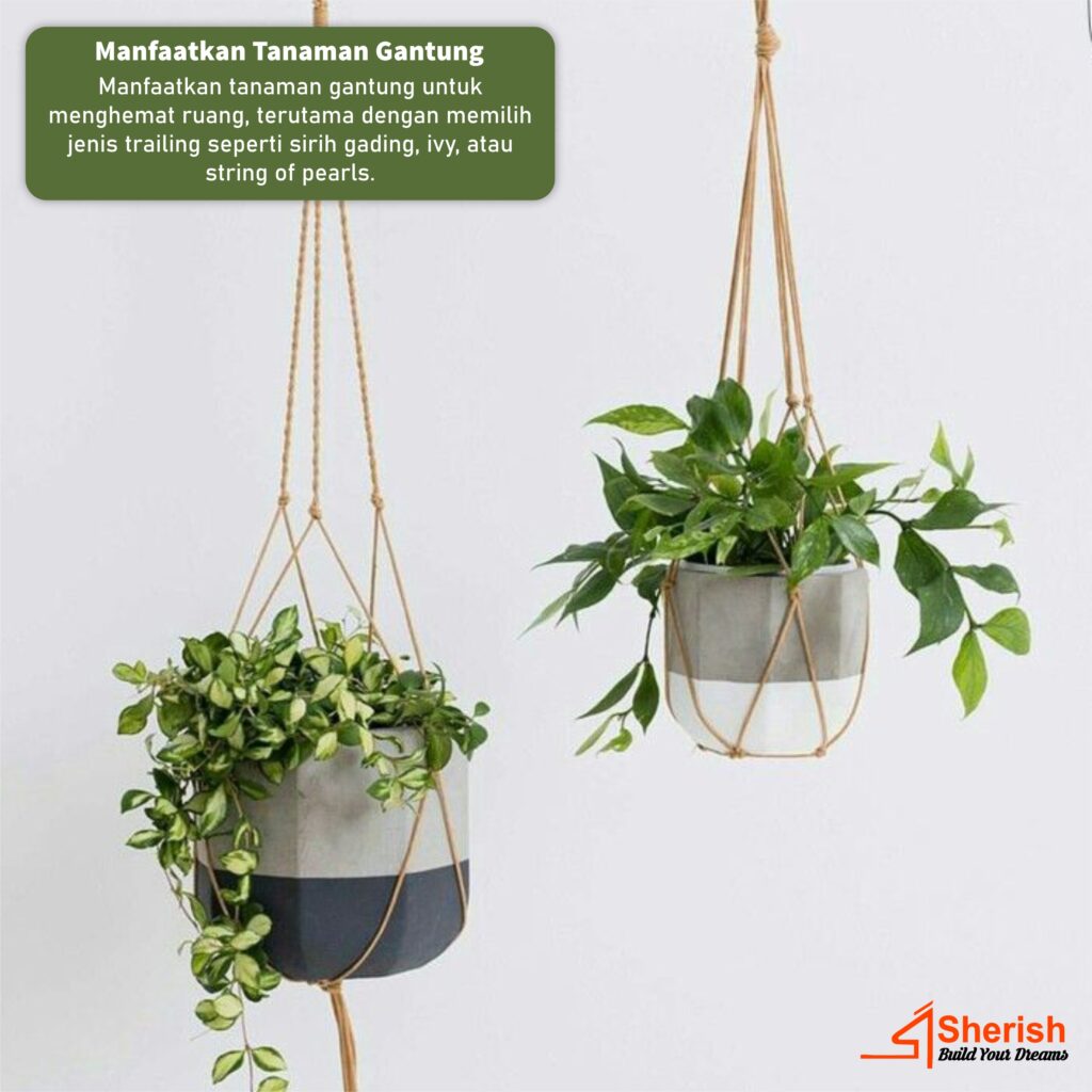 Manfaatkan tanaman gantung untuk menghemat ruang, terutama dengan memilih jenis trailing seperti sirih gading, ivy, atau string of pearls.